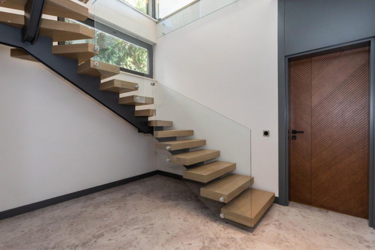 Этот проект — воплощение современного минимализма, где инженерная мысль служит чистой эстетике. Задача состояла в создании лестницы, которая кажется невесомой, но при этом является абсолютно надежной и безопасной конструкцией. В результате получился статусный арт-объект: «парящие» в воздухе ступени из бука и графичное реечное ограждение создают ощущение легкости и наполняют дом светом.
